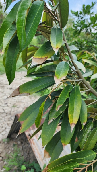 Nắng nóng, nhiệt độ cao khiến rễ sầu riêng kém phát, rễ không kịp hút nước để cung cấp cho quá trình thoát hơi nước của lá, làm cho lá bị cháy