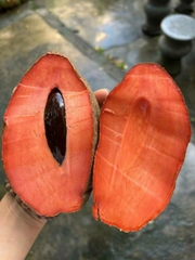 Quả Hồng Xiêm Ruột Đỏ Khổng Lồ thon dài khoảng 20-35cm, khi chín bổ ra ruột có màu đỏ tươi, ăn rất thơm và ngọt có giá trị dinh dưỡng rất cao.