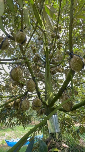 👉 Hiện tại, vườn sầu riêng đã bước sang giai đoạn 110 ngày sau đậu trái. Ngày hôm qua, thương lái đã vào cắt lứa đầu tiên với sản lượng khoảng 600–700 kg. Điều khiến đội ngũ kỹ thuật đặc biệt ấn tượng là độ đồng đều của trái trên toàn vườn. Đây là vườn sầu riêng tơ, cây mới 4 năm tuổi, mới chỉ cho trái bói năm đầu nhưng mỗi cây vẫn giữ ổn định từ 60–70 trái trở lên, cây nào cũng sai, cũng đẹp như nhau.