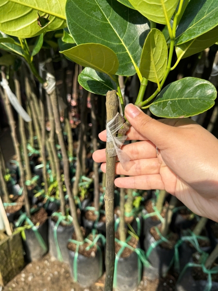 Hiện tại, Welofarm vẫn còn một lô cây Mít Ruột Đỏ gốc nhỏ, kích thước gốc dao động khoảng từ 1p3 – 1p4. Tuy không phải là những cây to, nhưng đây là lô cây được tuyển chọn kỹ, sinh trưởng khỏe, lá phát triển đồng đều, mỗi mắt lá đã bắt đầu chia khèo rõ ràng. Với cấu trúc tán lá như vậy, khi đem ra trồng ngoài môi trường, cây có khả năng thích nghi tốt, chịu nắng khá ổn và phục hồi nhanh.