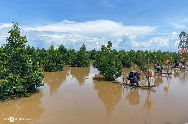 💧 Khi vườn đang ngập, bà con tuyệt đối hạn chế đi lại trong vườn, bởi đất lúc này đã mềm, rễ cây đang yếu. Mỗi bước chân lên mô có thể làm sụt đất, đứt rễ, khiến cây tổn thương nặng hơn. Ngoài ra, nước ngập khiến mương – liếp – bờ không còn ranh giới rõ ràng, di chuyển dễ trượt ngã, rất nguy hiểm.