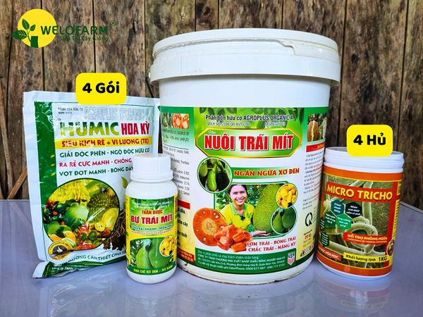 + Tưới: 1 túi 5kg Xô Nuôi Trái Mít + 1 gói Tricho Humic/1 hủ Micro Tricho + 1 gói Humic Hoa Kỳ + 2.500L nước. Tưới ướt đều tán gốc, từ 5-10L/gốc, tùy gốc lớn, nhỏ.
